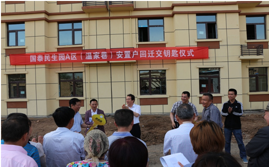 市国泰城投公司董事长苏天成同志和总经理安书文同志分别向拆迁安置户代表发放了新房钥匙。董事长苏天成同志表示:军民共建路棚户区改造项目是市委、市政府结合中央棚改政策、抢抓机遇主导实施的重点民生工程,国泰民生园A区1#安置楼只是整个项目的首批工程,今后我公司将在市委、市政府的领导下,全力以赴抓好民生工程建设,力争让军民共建路的拆迁户们早日都住上干净舒适、配套设施齐全的新房。