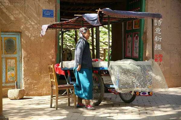 库尔班大叔忙着新修葺着房子,老伴儿在门口摆着小摊。这是个有魔力的小车,装着各种颜色的小果子,名字特别好听,白葡萄、玫瑰香、马奶子、红葡萄.......她手上挥舞的红布条,不像是赶蚊子的,更像是装饰品一般漂亮。按照维吾尔族的习俗,门楣上清真寺的是有儿子的,花朵的是女儿的。花儿越大就代表越漂亮,地位越好。我们看来大叔这的门就特别好看,老伴儿的小车就在这漂亮的门口停放,坐在车前,村里老小进进出出的就都看到了。